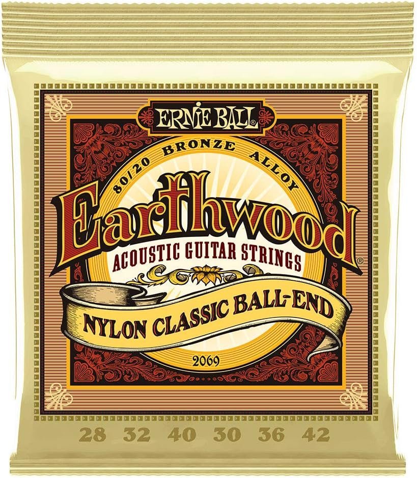 Ernie Ball Folk Nylon acoustic guitar plain strings are made of a solid nylon clear filament. Nylon produces rich pure treble tones with percussive attack. Ernie Ball folk nylon wound strings are made of 80/20 bronze wrapped around a multifilament nylon core. The plain and wound strings both feature ball ends for faster installation. Gauges .028, .032, .040p, .030 .036 .042
