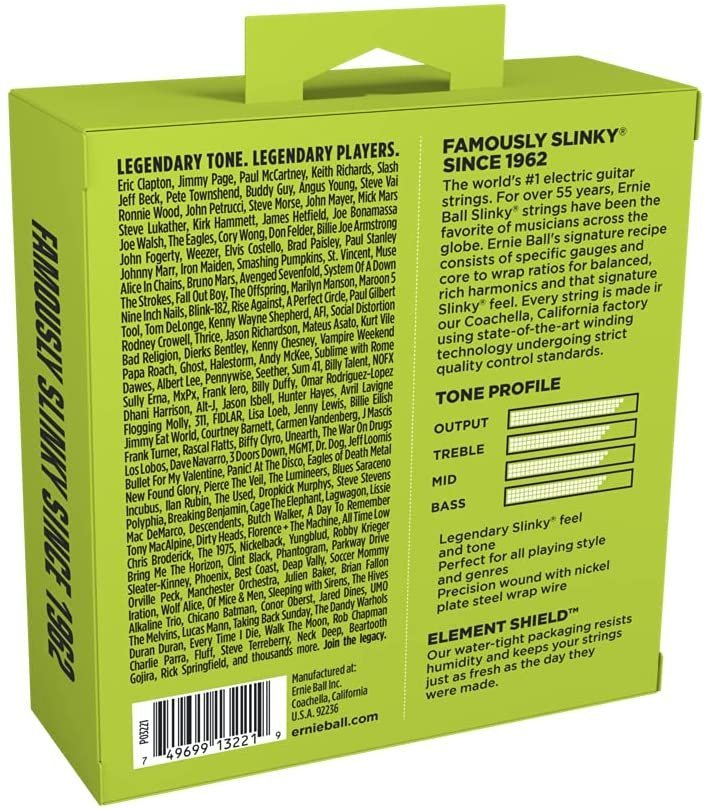 Now available in convenient three-set packs Ernie Ball Beefy Slinkys are optimal for detuning. These electric guitar strings are precision manufactured to the highest standards and most exacting specifications to ensure consistency, optimum performance, and long life. Beefy Slinky wound strings are made from nickel-plated steel wire wrapped around a hex-shaped steel core wire. The plain strings are made of specially tempered tin-plated high-carbon steel for that iconic Slinky feel and tone that players have relied on for decades. Beefy Slinky gauges are .011 .015 .022p .030 .042 .054.