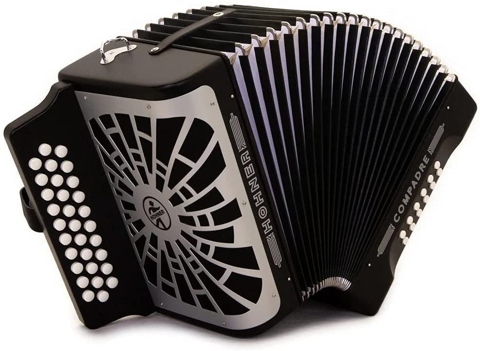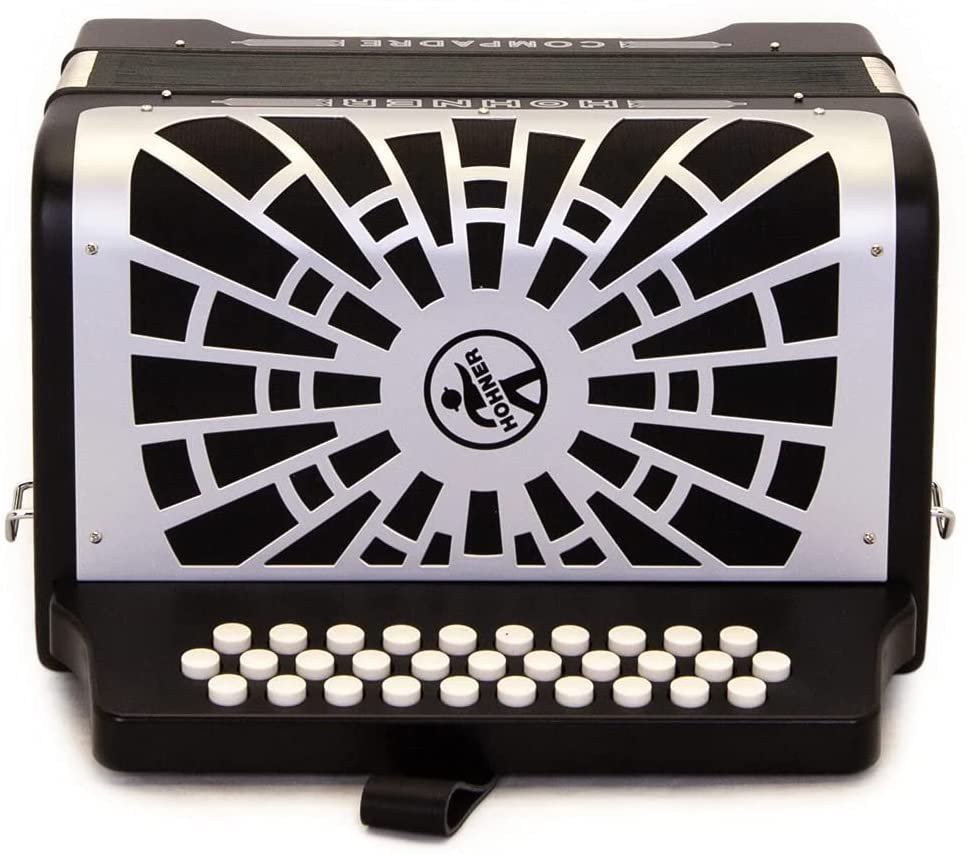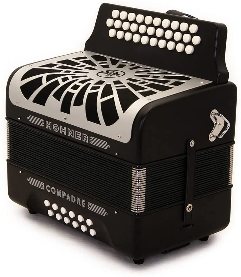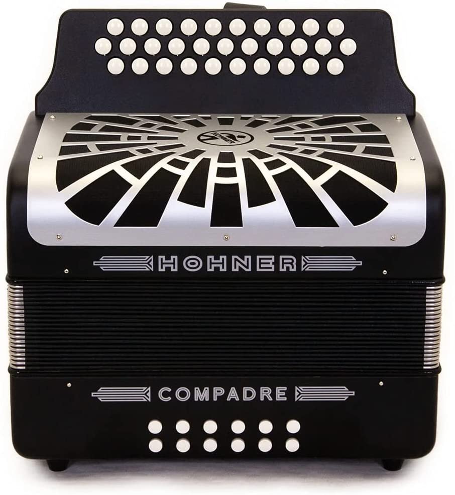 Hohner COGB Compadre 3-Row Diatonic Buttoned Accordion in the Key of G in Black The Hohner Compadre has great quality for beginners. We recommend GCF (SOL en espanol) for the beginner accordion player. The Hohner Compadre is the ideal purchase for the intermediate player, who already owns a GCF accordion, like the Hohner Panther . We highly recommend purchasing the Hohner Compadre in FBbEb (FA en espanol) for your second accordion. ADG (LA en espanol) can also be purchased, but this key combination is usually learned after GCF and FBbEb. Of course, opinions differ by location and key preference - You may find someone that will recommend ADG or BbAbEb (Cinco letras en espanol) as an ideal key for your second accordion purchase. Two reed accordions like the Hohner Compadre are a "Dry" sound, usually used in Norteno , Tejano , Conjunto , Rock, Folk, Polka, Blues, Jazz Styles etc.
