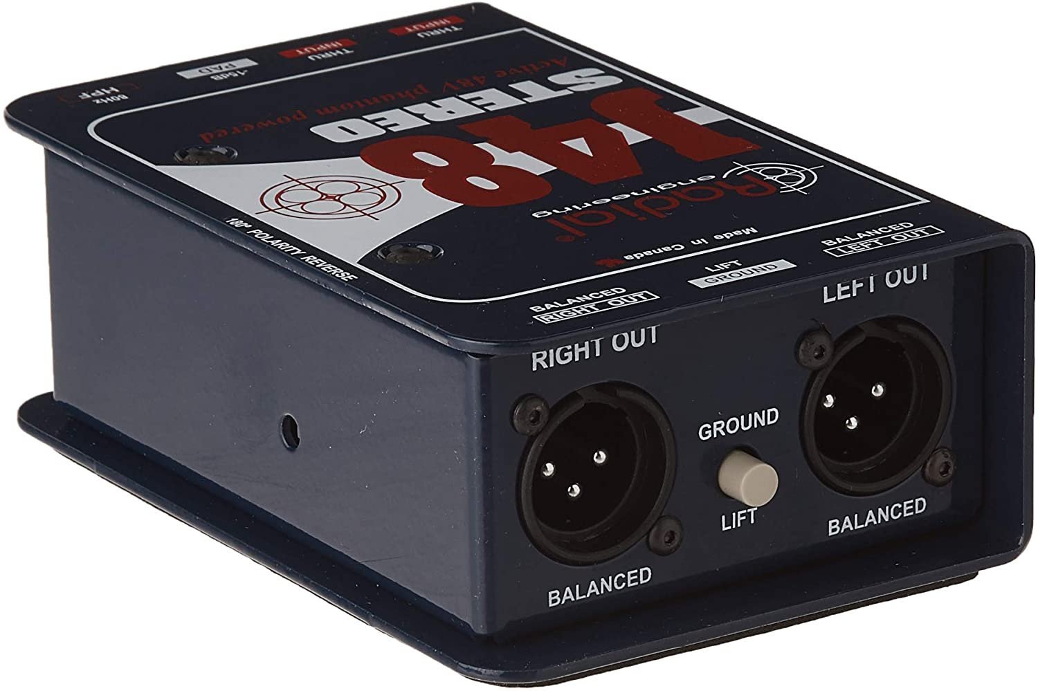 J48 Stereo Active Direct Box. "The Radial J48 Stereo is a high performance active direct box designed for professional touring and studio recording. It features the same award-winning signal path that has made the single channel J48 the most specified active direct box on tour today. And with users as diverse, you can be sure it will meet the most demanding qualifications. The design begins with a rugged 14 gauge steel construction and a bookend design that protects sensitive switches and connectors from damage. The internal I-beam construction ensures the fragile internal PC board will not torque, which in turn could lead to cold solder joints developing and premature failure. All connectors are made from glass-filled nylon and feature extra large nickel-silver contacts that will not tarnish over time. Inside, a unique switching power supply converts the 48 volt phantom to AC, increasing the headroom for improved signal handling and lower distortion. This results in an exceptionally linear frequency response that spans from 10Hz to 40kHz while being able to handle high output instruments without choking. In addition, a -15dB pad may be engaged for extreme signal handling. This is supplemented with a high-pass filter that gently rolls off low frequencies below 80Hz to clean up mud and excessive resonance. A side-access 180Ao polarity reverse aids when using the J48 Stereo with dual element pickups to either phase align the sources or eliminate acoustic hot spots that can cause feedback on stage. A unique aspect of the power supply is the way that the J48 handles buzz and hum caused by ground loops. The traditional solution is to lift the audio ground by disconnecting pin-1 at the XLR output. When this is done, the 48 volt phantom power from the console is shut off, forcing one to introduce a battery into the equation. Unfortunately, batteries are inconsistent, and when they begin to drop power, severely affect...
