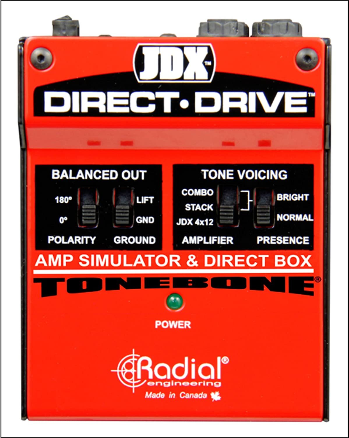 JDX Direct-Drive Amp Simulator and DI Box Guitar Effects. The Radial JDX Direct-Drive is a unique and powerful device that emulates the sound of a guitar amplifier while doubling as a direct box. Unlike a typical direct box that merely transfers the sound of the pedals to the PA, the Direct-Drive simulates the tone and feel of a real guitar amp, producing a much more realistic sound. In other words, with the Direct-Drive on your pedalboard, you can do a gig without carrying an amp to the club. The design begins with a traditional .25 in. guitar input and passive thru-put to feed a stage amp. This is then followed by a dedicated tuner output that is buffered in order to eliminate loading on the pickup or noise from the quartz clock. The guitar signal is then passed through a series of carefully sculpted filters to create Radial’s signature JDX tone. This is modeled after the sound of a Shure SM57 in front of a Marshall 4x12 cabinet. The Direct-Drive goes further with two more voicing settings: the first adds a vintage Marshall tube head character to the signal path while the second delivers a tone reminiscent of an early Fender Twin. The two amp tones can be further tailored using a presence switch for extra sparkle. The guitar signal exits the Direct-Drive via either a 1/4" guitar-level output or via a balanced XLR to feed the PA. The direct box output is outfitted with a 180° polarity reverse switch to help phase-align monitors with the stage amp along with a ground lift switch to help eliminate hum and buzz caused by ground loops. The Direct-Drive may be powered using a standard 9V power supply or typical pedalboard power brick. As with all Radial products, the Direct-Drive is made to handle the rigors of professional touring with 14-gauge steel throughout. This not only helps prevent damage to the internal PCB, it also reduces susceptibility to noise from external magnetic fields.