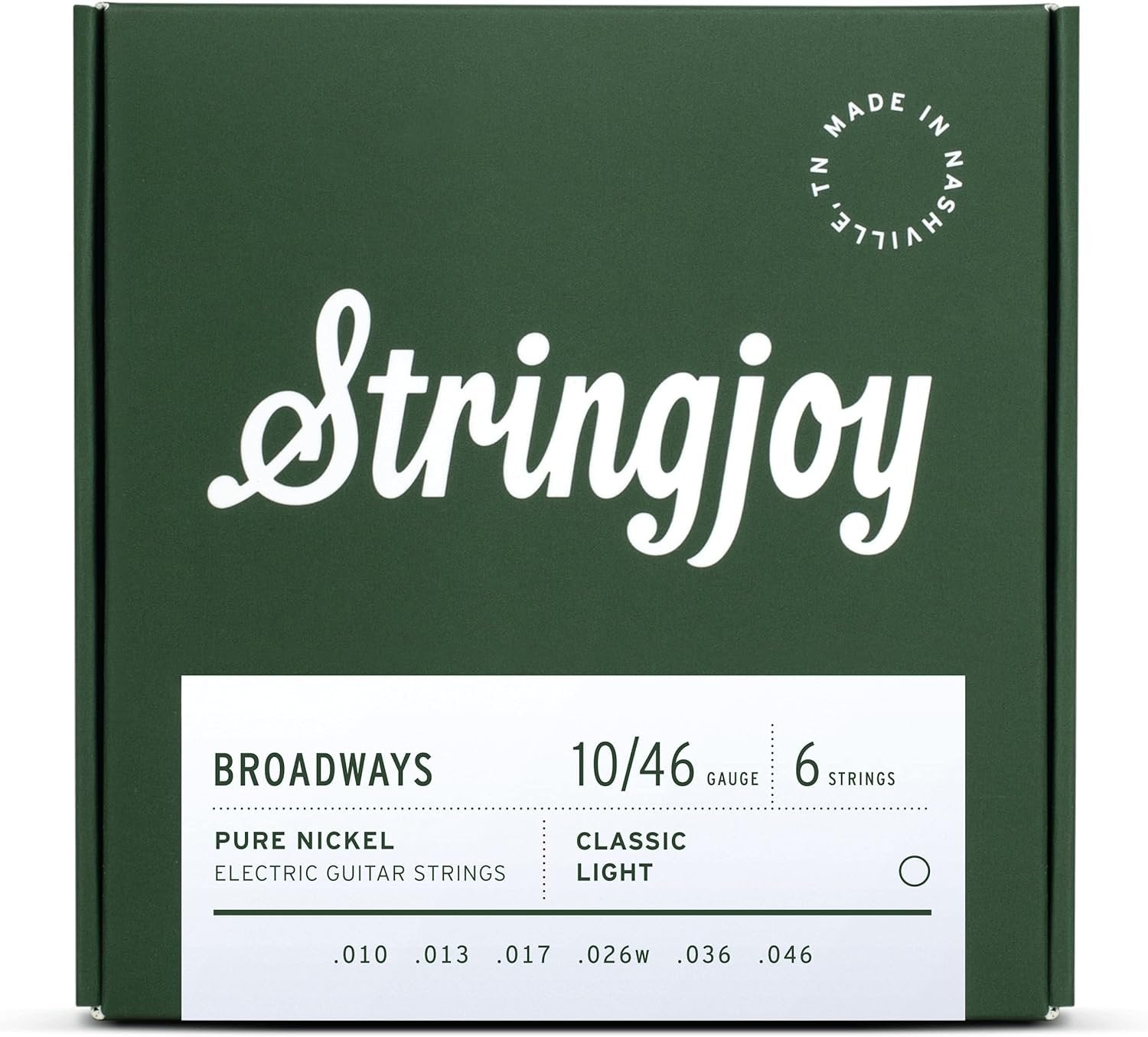 Stringjoy BR1046 Broadways Pure Nickel Electric Guitar Strings (Classic Light Gauge, 10-46)About this itemSTRINGS WON’T STAY IN TUNE? Look no further. We’re obsessed with quality control – every string we make is inspected by 3 different people so that we can guarantee your 6 string electric guitar strings will resonate, intonate, and stay in tune.THE SMOOTHEST STRINGS YOU’LL EVER PLAY! How’s that? Science, that’s how. Every Stringjoy 6 string electric guitar string set is mathematically optimized to balance tension, and give you a smooth, even performance across the entire fretboard.INCONSISTENT TONE? Yuck. We’ve got you covered there too. Our 6 string guitar strings have a full, powerful sound that’s quick to hit the sweet spot, and stays there for longer – so every time you pick up your guitar, it’ll sound the way you want it to.WE STAND BY OUR PRODUCT! We stand behind every set of strings we make. You can buy today with confidence, because if anything ever goes wrong, we’ve got your back. No ifs, ands or buts.