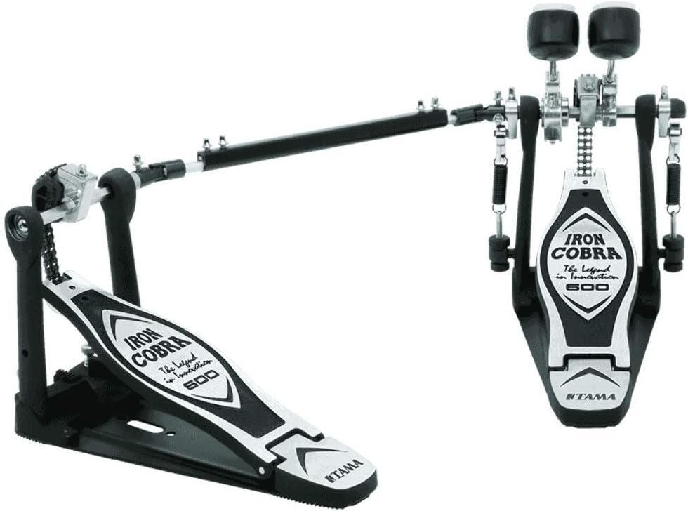 Iron Cobra 600 Series Double Bass Drum Pedal. The Iron Cobra 600 series by Tama are a new addition to the Iron Cobra family. Its most striking feature is a changeable cam. Called the "Duo Glide Cam," it allows simple adjustment between a "Power Glide" cam for power and speed, and a true round "Rolling Glide" sprocket for smooth consistency. Drummers can choose the appropriate action based on playing style, musical environment, and personal preference. Iron Cobra 600 series pedals also feature a newly designed hinge for precise footboard action, and the "Speedo-Ring" rocker cam with a smooth ball bearing. Additionally, this double pedal bears the same heavy-duty Double Chain Drive as 900 series Iron Cobra pedals. The chains offer smooth, accurate action.